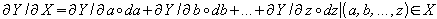 Die Hauptgröße sei Y und die Einflussgrößen hierauf seien alle Elemente aus X, d.h. hier alle Kleinbuchstaben von a bis z; die Anzahl der Einflussgrößen sei zunächst ohne besonderen Grund auf 26 beschränkt. Das Leibniz-d stehe für eine Veränderung, die mit der jeweils dahinterstehenden Größe geschehe; es wird zunächst davon ausgegangen, daß diese Veränderung gegeben sei. Der Kleinbuchstabe d meint ebenso die Veränderung der dahinterstehenden Größe (Einflussgröße), jedoch als Gewicht die Änderung beschwerend.